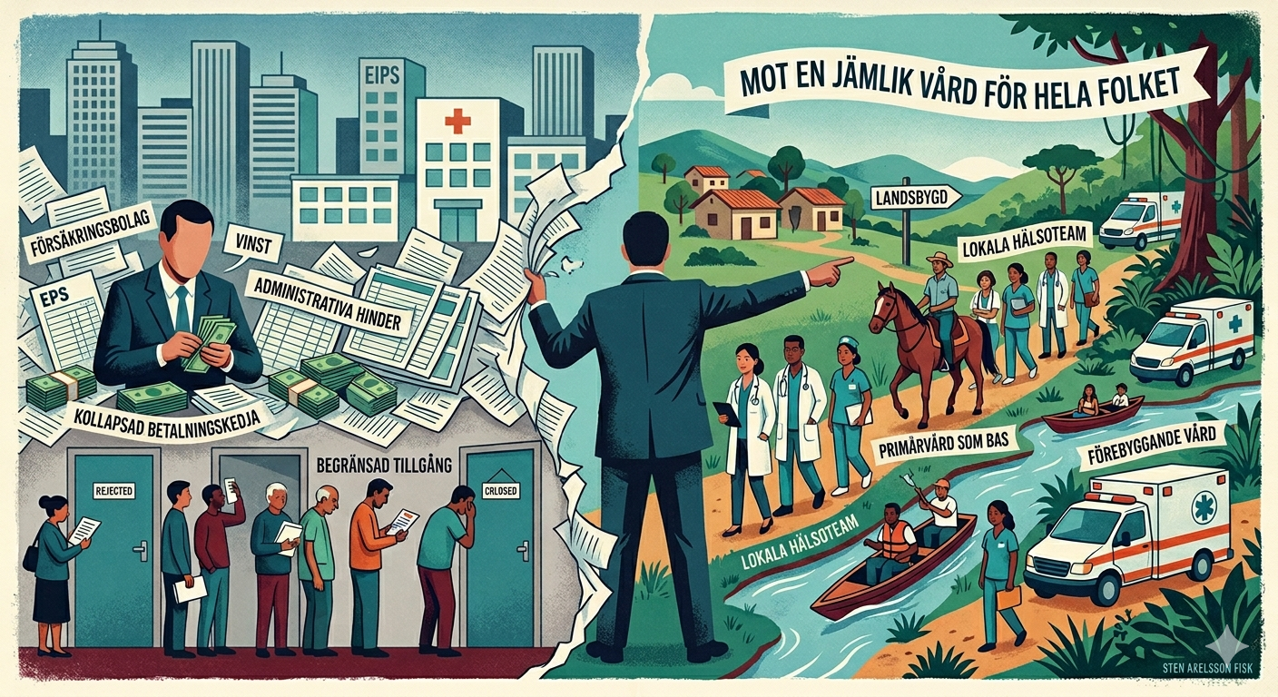 Colombias första vänsterpresident Gustavo Petro försöker reformera sjukvårdssystemet i grunden och stoppa de vinster som försäkringsbolag, som agerar mellanhand, kan plocka ut ur Colombias hälsobudget. Frågan om försäkringsbolagens vara eller inte vara har utlöst en skarp politisk kris i Colombia. Försäkringsbolagen som har fått i uppdrag att administrera offentliga medel för att betala befolkningens sjukvård har slut på resurser och anklagar regeringen för att inte skjuta till det som krävs, vilket gör att många personer blir utan vård. Regeringen svarar att skattebetalarnas pengar inte ska gå till privata företag som gör vinst. Den finansiella krisen har orsakat en kollaps av betalningskedjan; när EPS inte kan betala sina skulder blir vårdgivare – kallade IPS – ovilliga att utföra vårdinsatser som de inte kommer att ersättas för. När Petros regering väljer att inte skjuta till pengar har den akuta sjukvårdskrisen accentuerats.